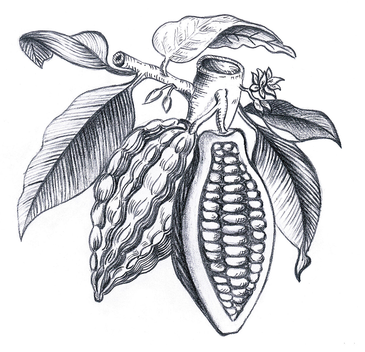 Ilustración a lápiz de la fruta del cacao. Cliente Abellán Biofoods para su marca Natural Bioaprica.